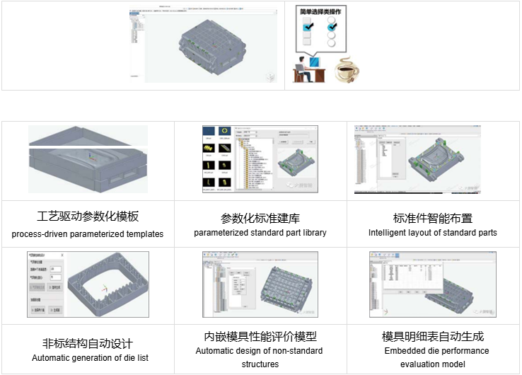 非标结构自动设计 Automatic generation of die Iist | 内嵌模具性能评价模型 Automatic design of non-standard structures | 模具明细表自动生成 Embedded die performance evaIuation modeI |